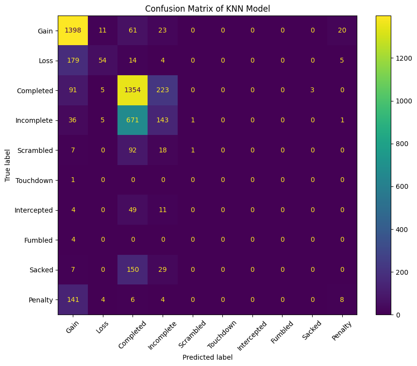 So, I’m at a bit of a crossroads, with a few ways forward. It may be simpler (for the initial project/submission) to build a linear regression model that takes pre-snap play data as features, and then looks at yards gained (or loss) for the output. Conversely, if I stick with the KNN model I’ll need to make some changes. The majority of the outputs are either Gain or Completed, which refer to a positive rushing play and a completed pass, respectively. The issue here, the model overwhelmingly predicts those values, but fails to accurately predict things like Touchdowns, Sacks, or Interceptions.